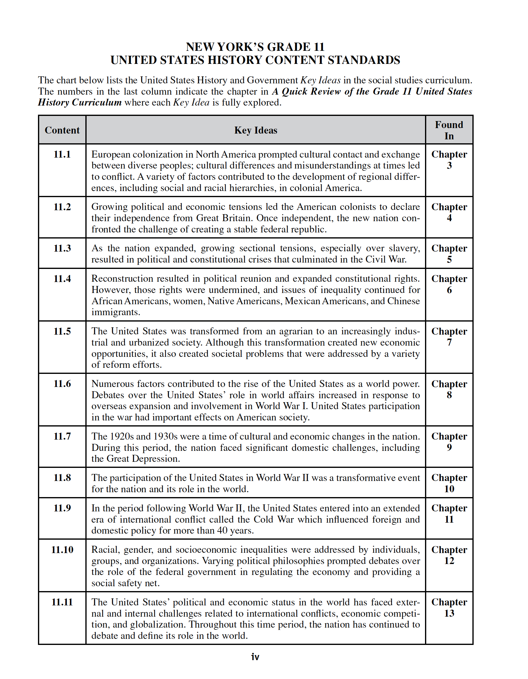 This book is fully aligned to the new grade 11 framework in U.S. history. Each of the Major ideas in the curriculum are covered in a comprehensive fashion. Each Key Idea in the framework is covered in a chapter that is completely dedicated to that Key Idea with a thorough review of all of the related Content Specifications. If there is content material that is covered or discussed in one of the Content Specifications, you can be assured that it is covered in a comprehensive manner in this book.